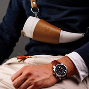 • Functional Leather Case: The leather case not only enhances the mug's aesthetic appeal but also doubles as a stand, making it easy to place on any surface.