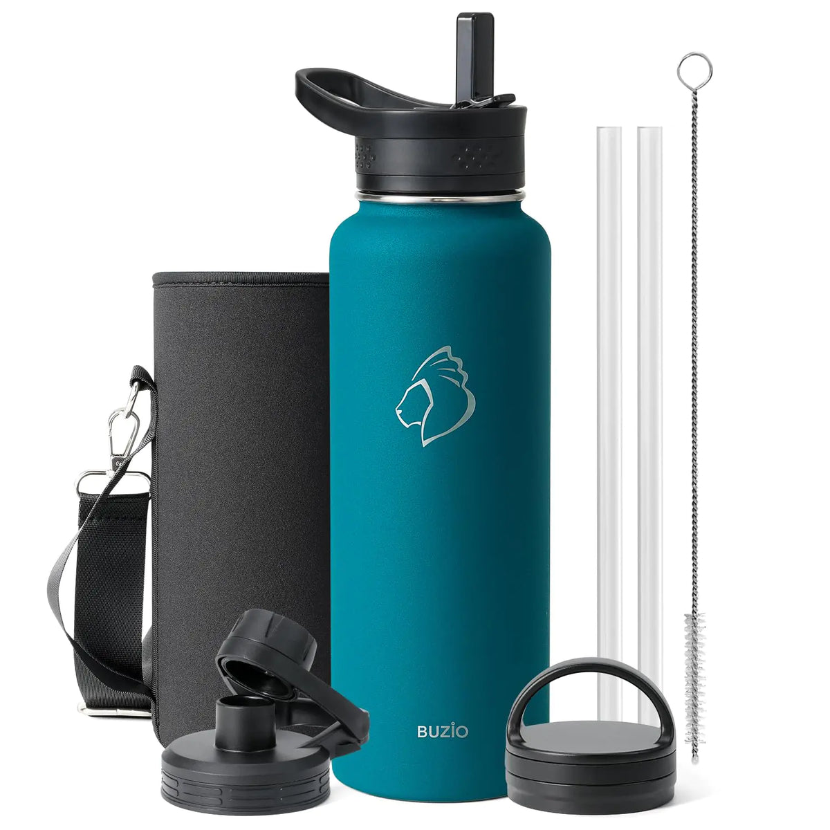 BUZIO 40 oz Water Bottle Insulated with Straw & 3 lid and Carrying Pouch Leak Proof Anti-Slip Stainless Steel Water Flask Jug Cold for 48 Hrs Double Vacuum Thermo Canteen BPA-Free Blue - Dark Blue / 40 Ounces