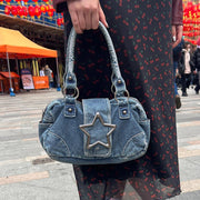 Fashion Retro Metal Five-pointed Star Decoration Denim Handbag For Women