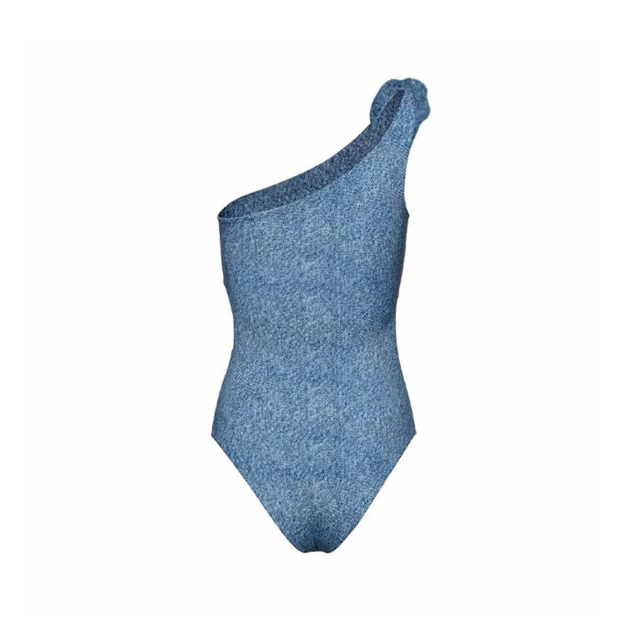 Traje de baño siamés vaquero suave, hueco, de un solo hombro y con flores decorativas - Traje de baño y falda / L