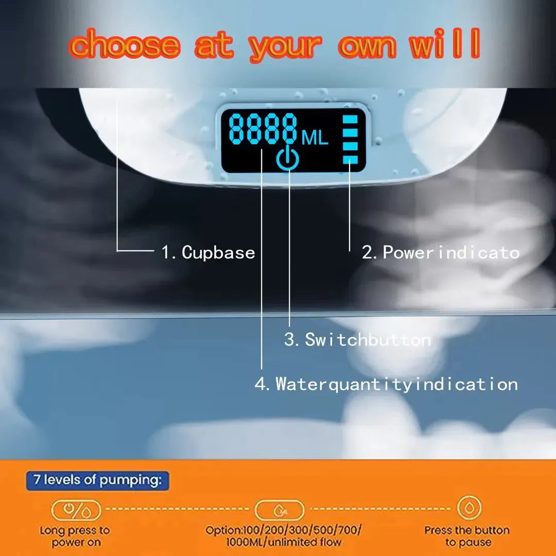 1. Smart with 8 levels of quantitative pumping, 8-stage capacity selection with indicator light (100ml, 200ml, 300ml, 500ml, 700ml, 1000ml, and unlimited flow), the electric water dispenser is suitable for various types of bottles (1~5 gallon).