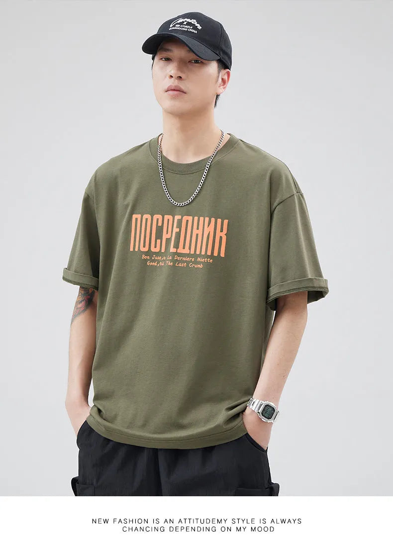 Letter Printed T-Shirt Japanese Loose Cotton Shirt - Army Green / 3XL