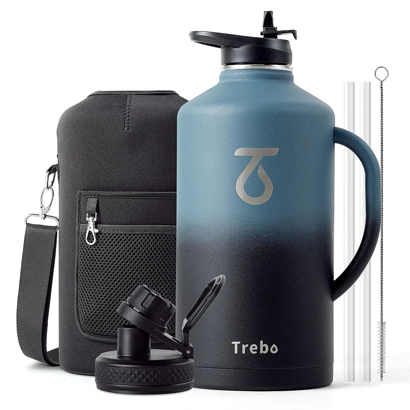 Trebo 128 oz Water Bottle Insulated with Handle One Gallon Stainless Steel Metal Large Jug Travel Flask with Straw Spout Lid Mug Tumbler Cup with Carry Pouch Keep Cold Hot Indigo Black - Indigo/Black / 128 Ounces