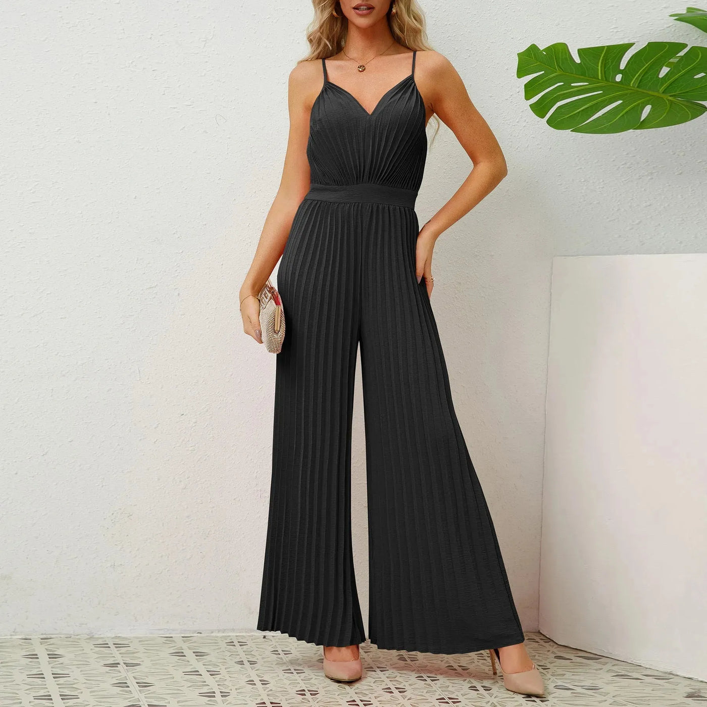 V-neck Suspender Pleated Jumpsuit Solid Color Loose Straight Pants Womens Clothing - Black / 2XL
