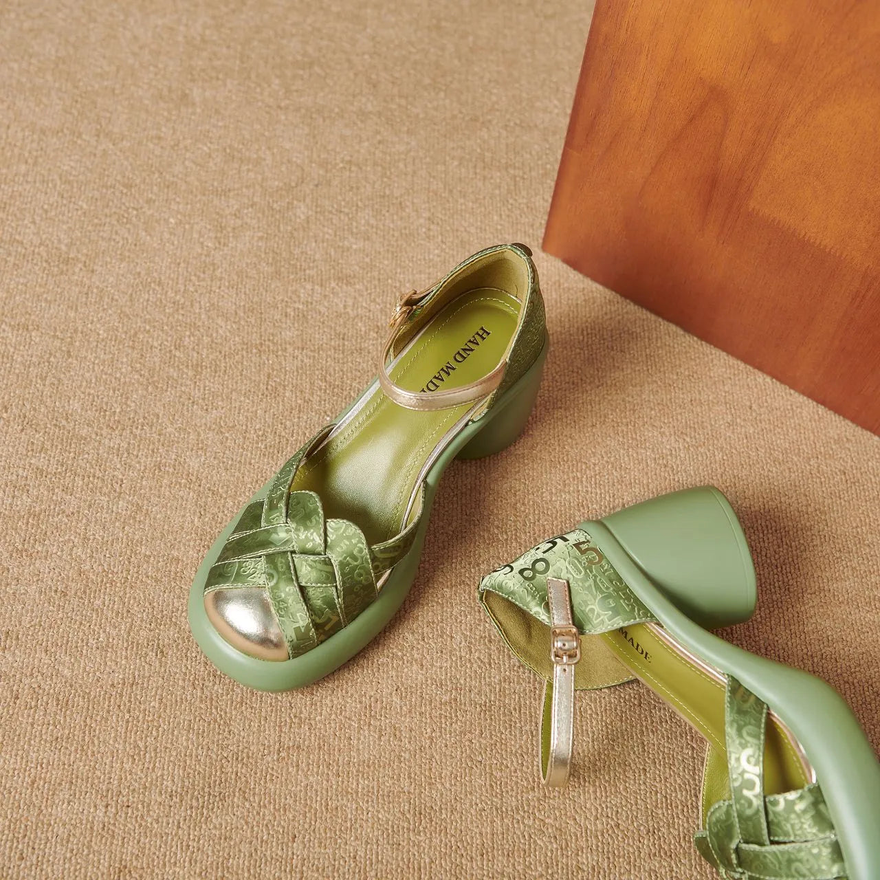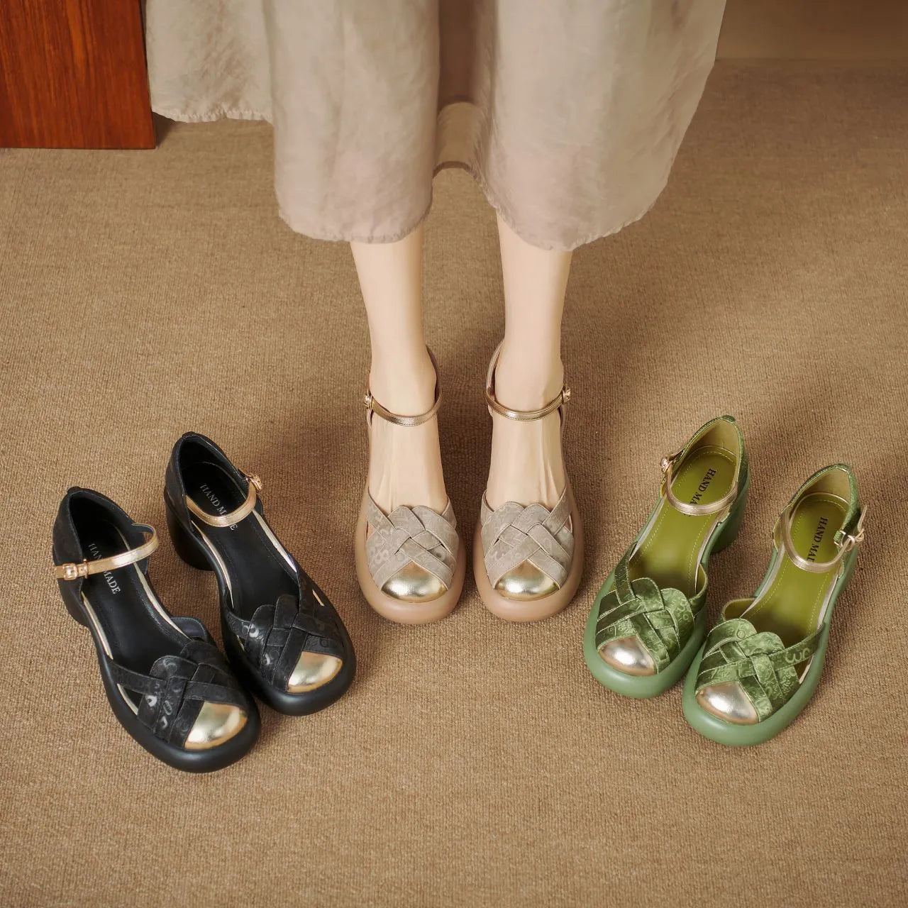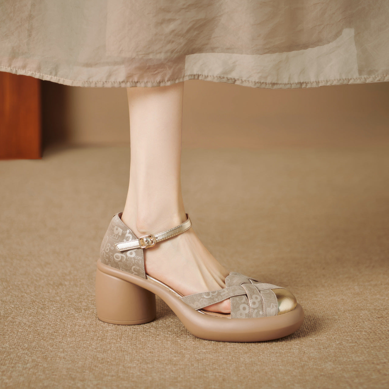 Elevate your style with our Women's Chunky Heel Soft Leather Sandals. Crafted with premium materials, these sandals feature a thick bottom and woven strap for a touch of sophistication. Enjoy all-day comfort and effortless elegance with these soft apricot sandals.